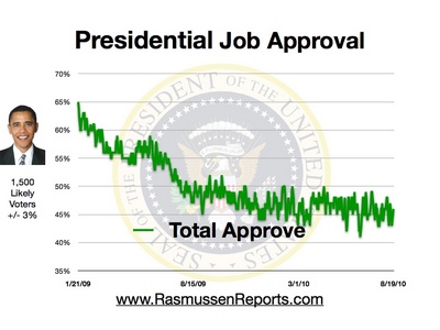 We believe that a 38% approval total is possible for the Adolescent Governor. If you look carefully at the chart, Obama's averages have decreased slightly over the course of the past 2 months. Increasing jobless numbers, the fact that he has only watched as Iran has become a nuclear power, the failure of the "reset" policy with the Russians, his "foot in mouth" disease and the fact that he has done nothing to change the partisan climate in D.C., nothing, have and are contributing to an open and undeniable election year disaster. After the 2010 midterms, it is commonly believed that he will be facing a stronger GOP in Congress. No one has a clue as to how he will approach this reality. Bill Clinton moved to the center and worked with a GOP Congress to balance the budget, each of the last four years he was president. Note that Clinton and the Democrat Congress of his first two years balanced NOTHING. It was Clinton and the Newt Republicans who balanced the budget and gave the nation a "surplus."