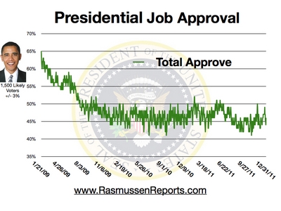 I pulled this chart off Rasmussen's site. Since the first of December,  2009,  Obama has scarcely rated above the 50 percentile line.  In fact,  since mid-September,  his numbers have trended downward two or three points.